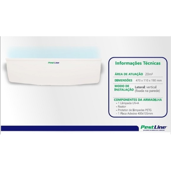 • 1 Armadilha Luminosa Ultralight Eco-15 BIVOLT equipada com 1 lâmpada UV-A no comprimento de onda de 365 nanômetros + 5 placas adesivas Eco (Refil 400 x 135 mm).