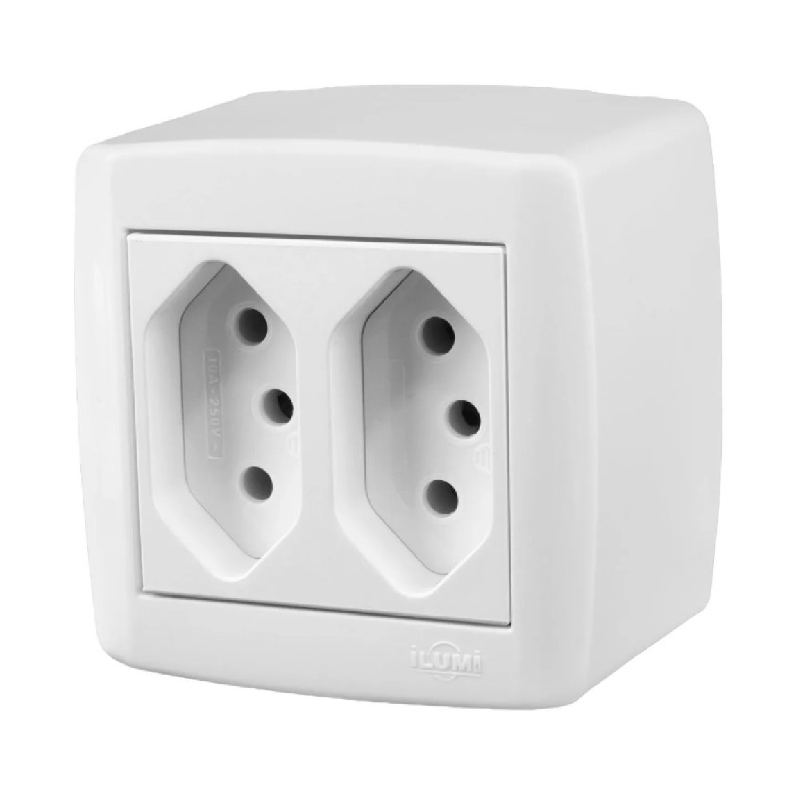 Este conjunto inclui uma caixa de sobrepor equipada com uma tomada de energia fixa, projetada para atender às demandas elétricas de equipamentos de maior potência.