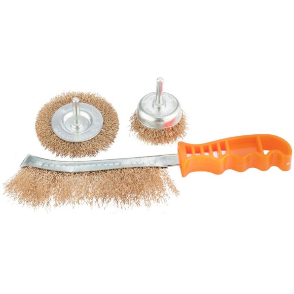O Jogo de escovas de aço com 3 peças da MTX é composto por: uma escova plana com diâmetro de 65 mm, uma “copo” com diâmetro de 50 mm com pinos de 6 mm de diâmetro e uma manual de metal. Eles removem com eficácia finas camadas de ferrugem, tinta, verniz e também removem sujeira. O acessório em forma de copo é conveniente para trabalhar em superfícies lisas, enquanto o plano é adequado para trabalhar em ranhuras e cantos. Recomenda-se utilizar uma ferramenta com velocidade de fuso de até 4500 rpm. Uma escova manual é útil para limpar pequenas áreas quando o uso de ferramentas elétricas não é prático.